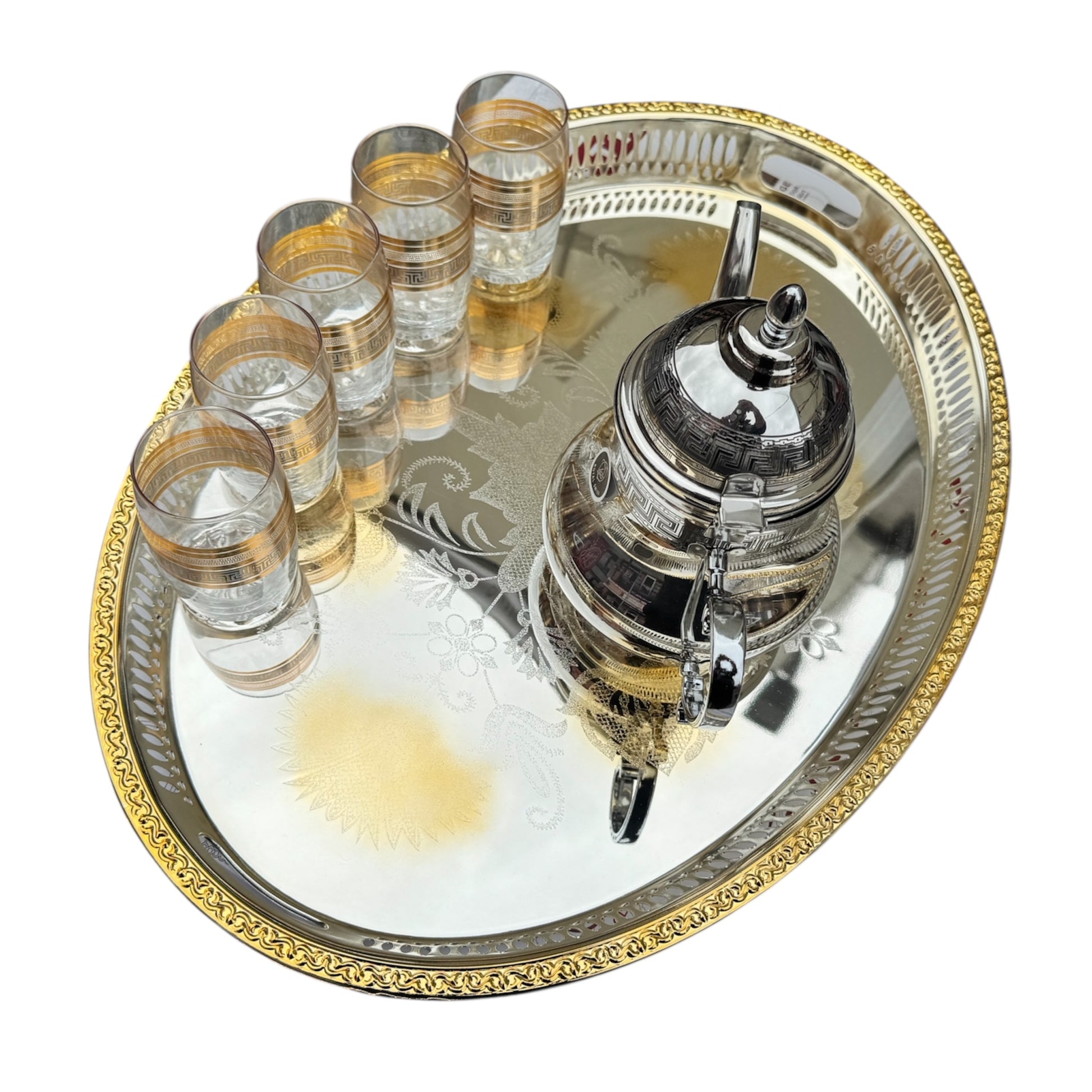 Marokkaanse theeservies met zes Marokkaanse theeglazen met gouden rand, evenals een prachtig Marokkaans dienblad met zilveren en gouden details, een typisch Marokkaanse theepot